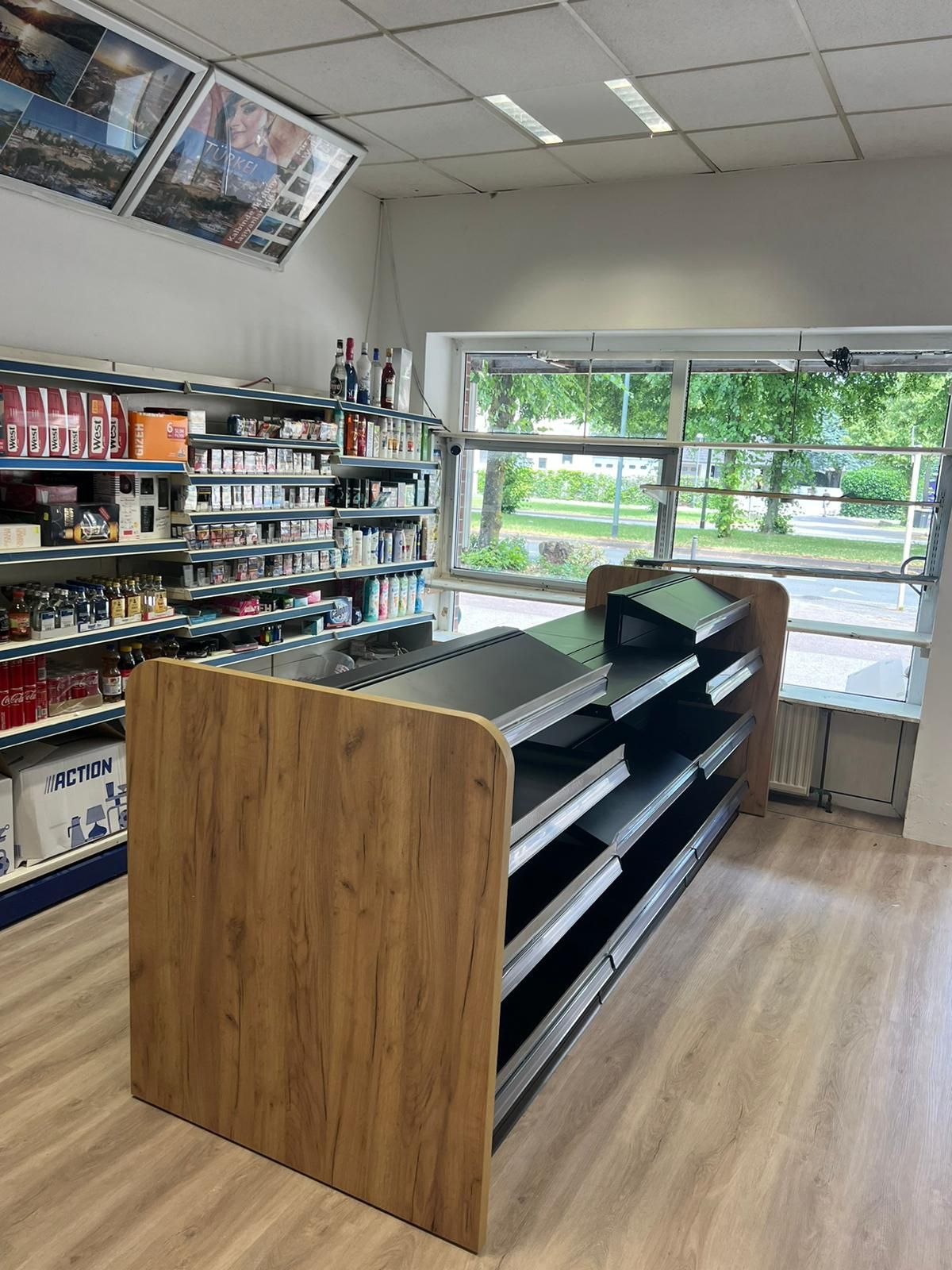 In diesem Projekt haben wir die Einrichtung von einem Kiosk realisiert. Die Kiosktheke ist das Herzstück des Verkaufsraums und wurde so konzipiert, dass sie den Arbeitsablauf effizient unterstützt. Hinter der Verkaufstheke wurden spezielle Ladenregale installiert, die optimal auf die Bedürfnisse eines modernen Kiosks abgestimmt sind. Das Wandregal bietet großzügigen Platz für die Präsentation verschiedener Produkte, während das integrierte Zigarettenregal eine übersichtliche und leicht zugängliche Aufbewahrung der Tabakwaren ermöglicht. Die klaren Linien und die hochwertige Verarbeitung sorgen für ein ansprechendes und professionelles Erscheinungsbild.