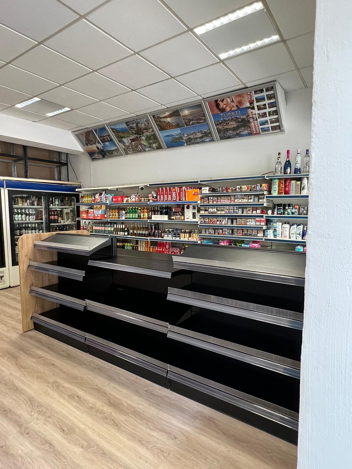 In diesem Kiosk aus Karlsruhe sehen Sie ein von uns gestaltetes Projekt. Unsere Arbeit umfasste die optimale Platzierung der Regale, eine ansprechende Produktpräsentation sowie die Installation moderner Kühlregale. Der Boden in Holzoptik und die dezente LED-Beleuchtung verleihen dem Raum eine einladende Atmosphäre, die das Einkaufserlebnis verbessert. Zudem Wurden die Eckelemente der Wandregale mit Eckböden aufgebaut um ein Nahtloses Verkaufserlebnis zu schaffen. Das Gondelregal in der Mitte wurde jeweils auf beiden Seiten mit einem Kopfregal beendet.